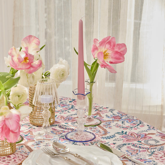 Blue Rimmed Glass PomPom Candleholders (Pair)