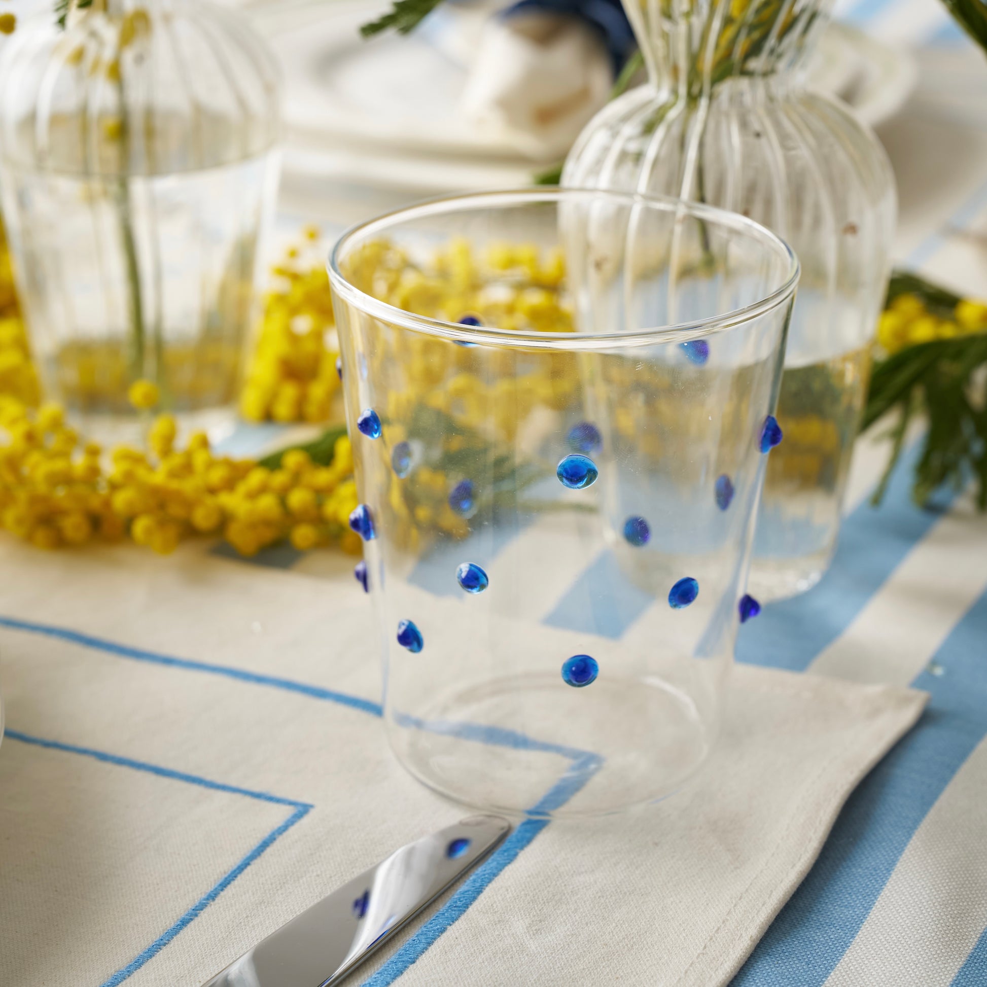 Our Blue Dotted Glasses bring a warm glow to your table while being sturdy enough for daily use.