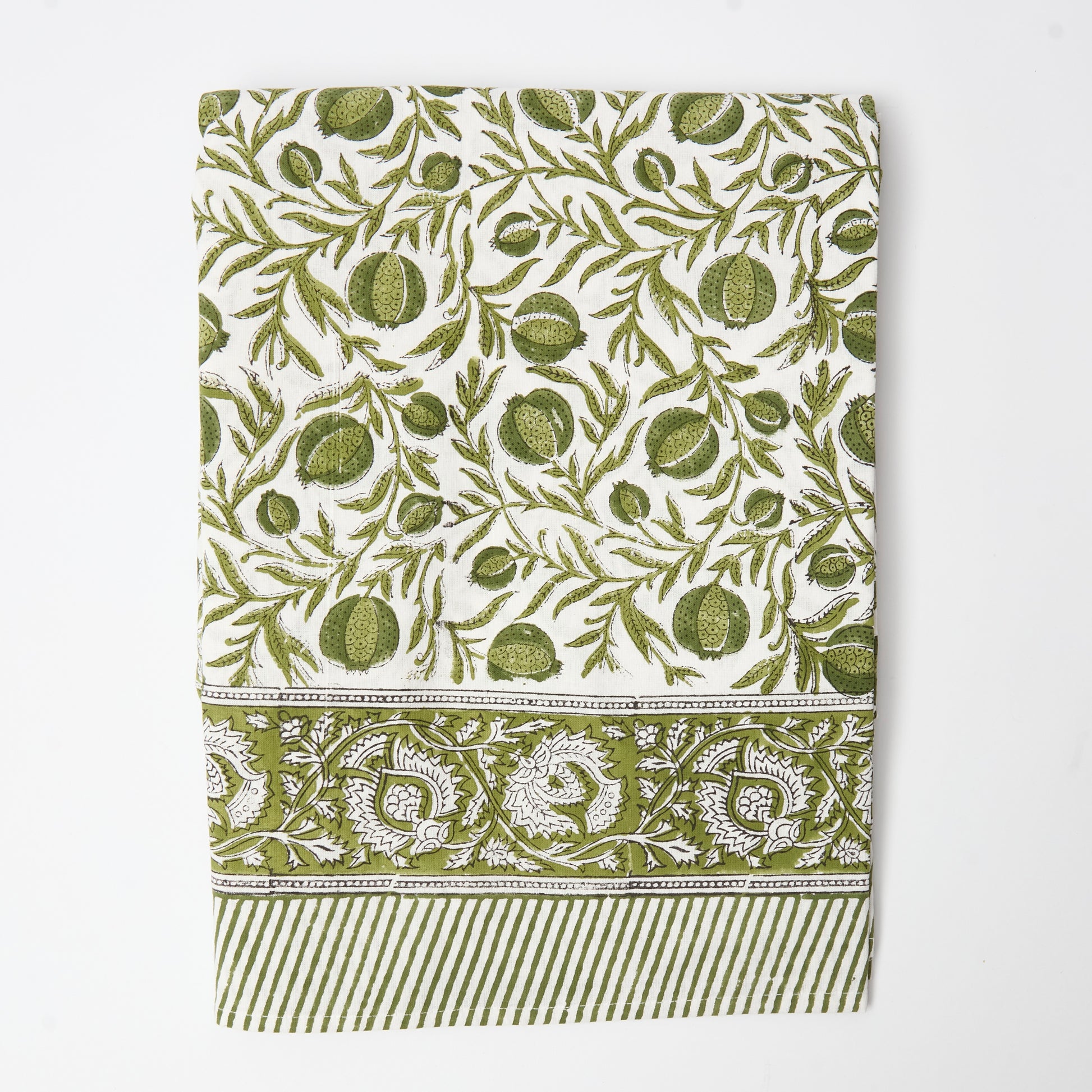 Welcoming our favourite Pine Green Pomegranate Tablecloth, beautifully hand-printed by talented artisans. Featuring a delicate two tone pomegranate motif, this tablecloth adds an upbeat Spring feel to your tableware collection.